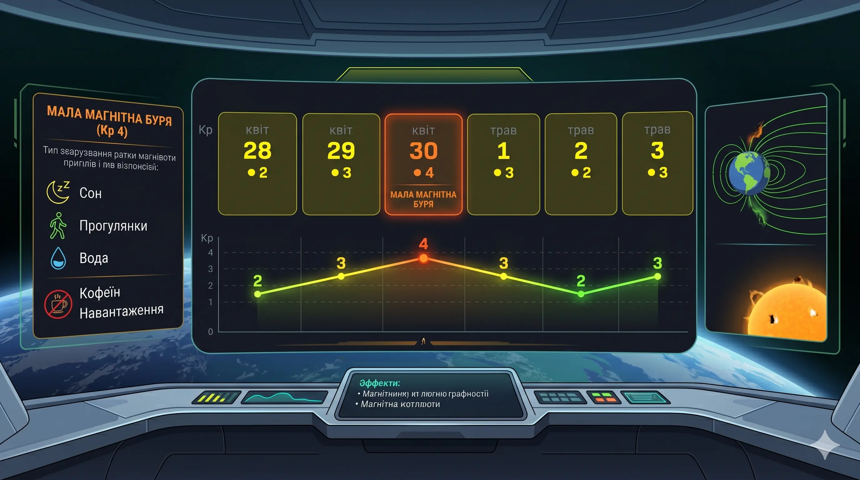 График активности на неделю: Сегодня, 28 апреля, геомагнитное поле остается относительно спокойным с показателем Kp=2. Однако уже в среду, 29 апреля, напряженность возрастет до Kp=3 (слабое возмущение). Самым сложным днем недели станет четверг, 30 апреля: ожидается усиление до Kp=4. Это уровень малой магнитной бури, которая может стать причиной дискомфорта.